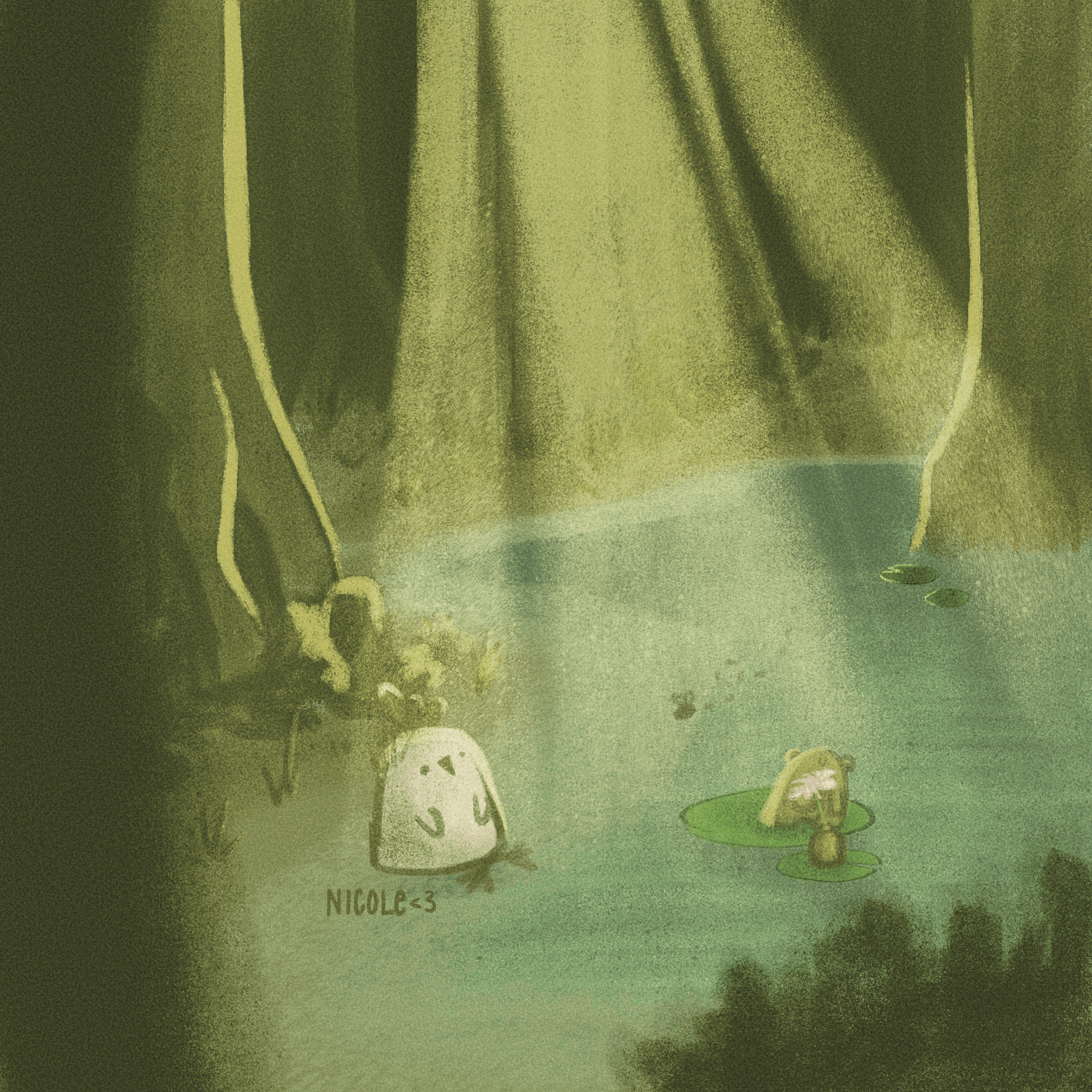 A concept illustration for a children's book about a chicken and a frog who are best friends and care about the planet! The goal was to make nature feel magical, rays of light illuminating the beauty of the forest while also focusing on character design and stylized storybook illustration.